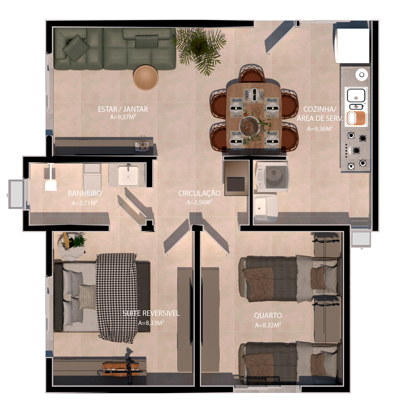 São 2 quartos, sendo 1 suíte reversível, vaga de garagem e um condomínio pensado para o seu bem-estar.